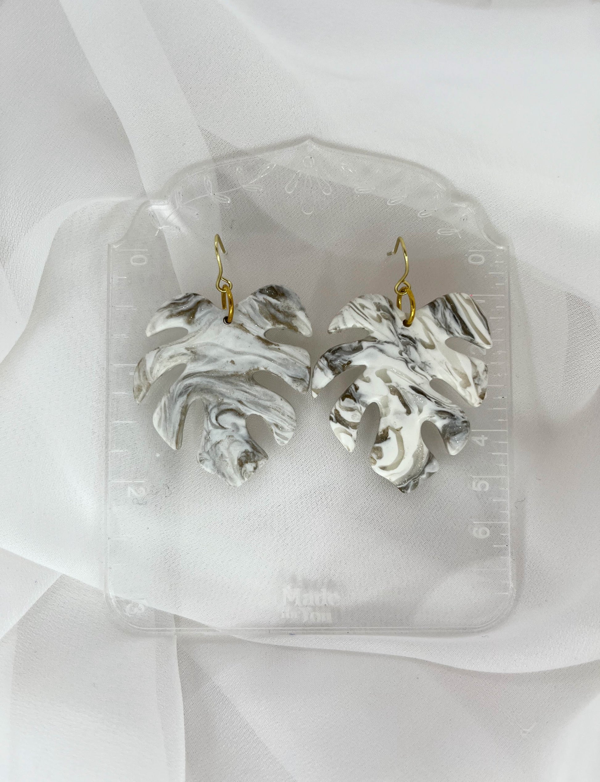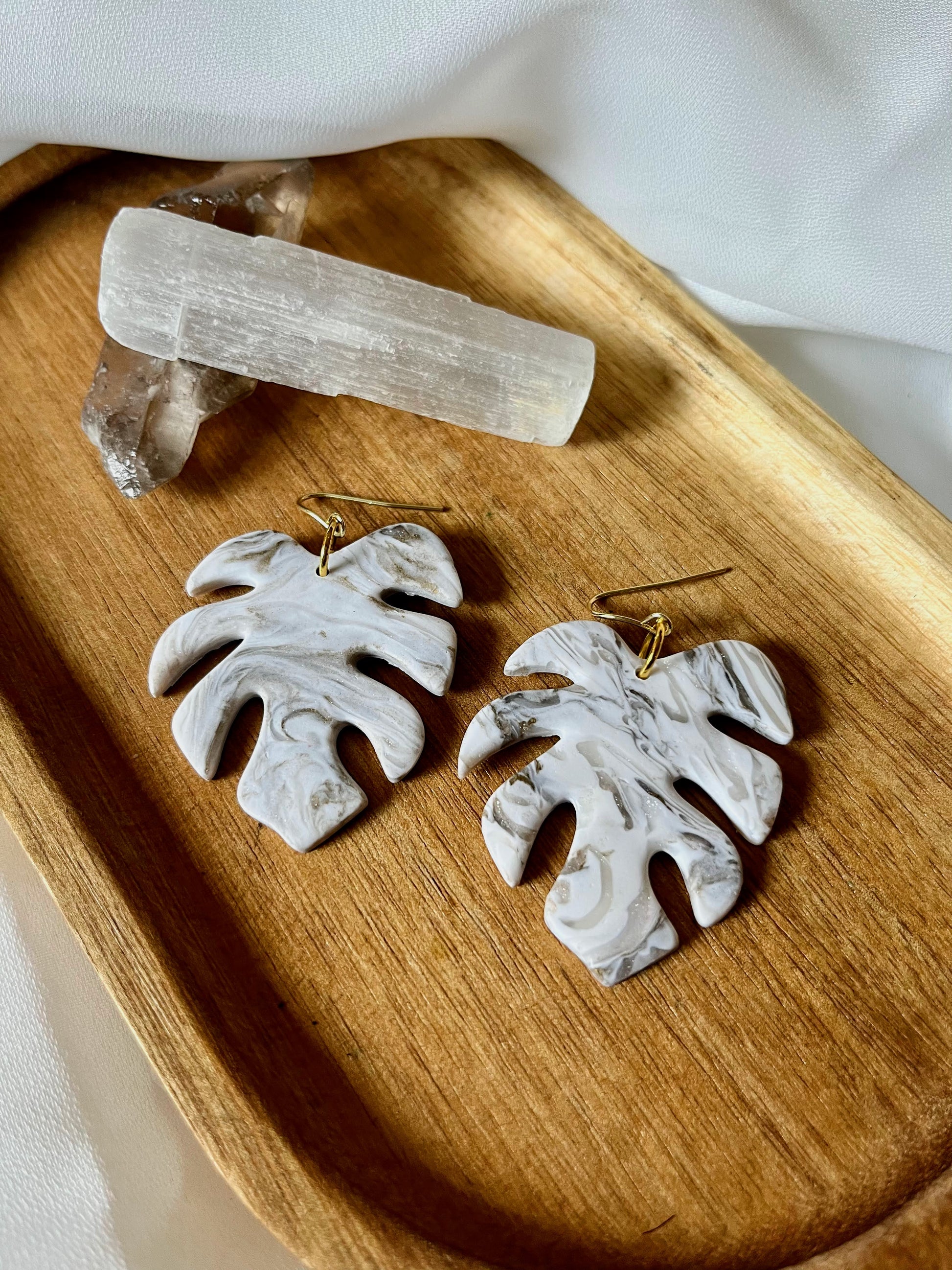 These Monstera leaves are made with a combination of marshmallow white, antique gold, slate grey, and shimmery translucent. When translucent clay is blended and incorporated with other colors, it creates unique depth to a piece that can be brought out through sanding! Bonus: sanding also creates a buttery smooth texture that is *chef's kiss*