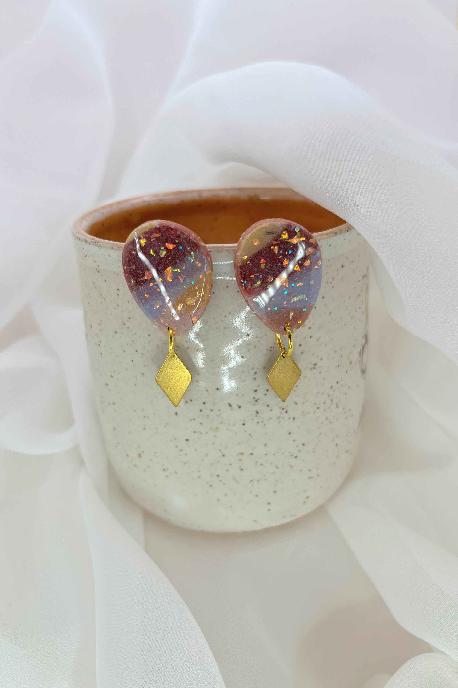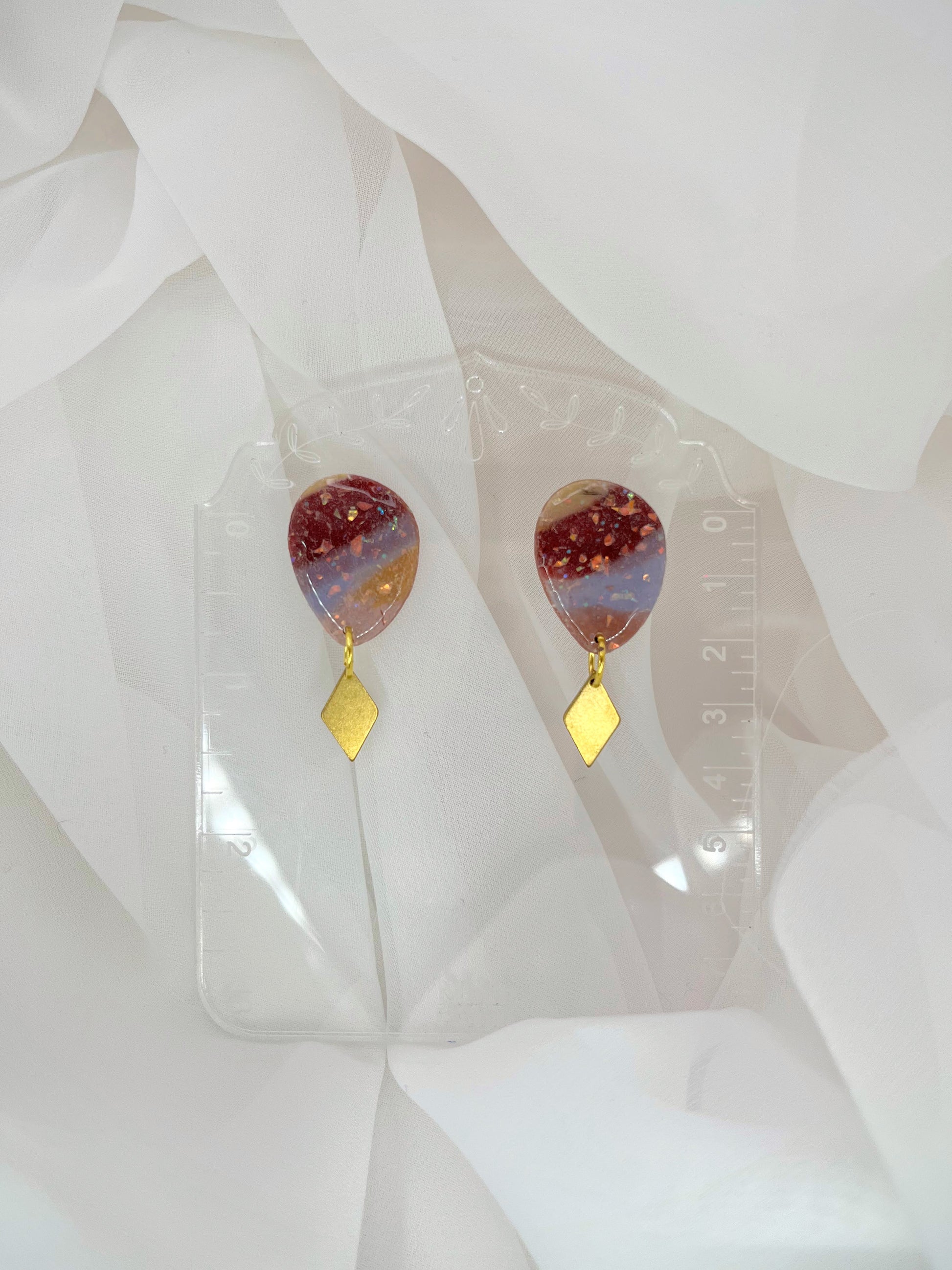 There are pops of faux opal flakes sprinkled throughout these designs that reflect a spectrum of pink, orange, blue, and green. These earrings also feature small brass accents in the shape of diamonds.